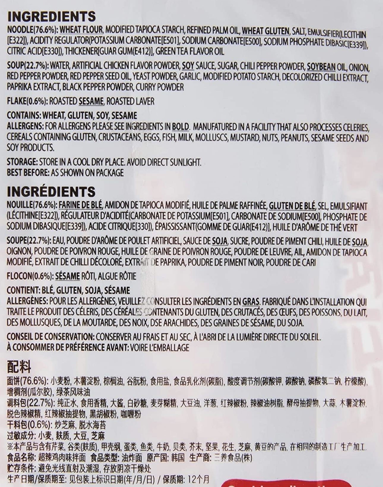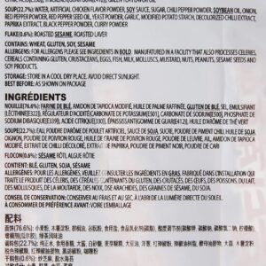 Noodle: Wheat Flour, Modified Tapioca Starch Palm Oil, Wheat Gluten, Salt, Soybean Oil, Sugar Solution, Sweetener[D-Sorbitol Solution(E420)], Potato Starch, Thickener[Guar Gum(E412)], Acidity Regulators[Potassium Carbonate(E501), Sodium Carbonate(E500), Sodium Phosphate Dibasic(E339), Citric Acid(E330)], Emulsifiers[Lecithin(E322), Sodium Polyphosphate(E452), Sodium Pyrophosphate(E450)], Colour[Riboflavin(E101)]. Soup: Water, Soy Sauce, Artificial Chicken Flavour, White Sugar, Spices (Red Pepper Powder, Black Pepper Powder), Soybean Oil, Onion, Seasoning (Yeast Extract Powder, Curry Powder), Red Pepper Seed Oil, Garlic, Flavour Enhancer[Disodium 5’-Ribonucleotides(E635), Monosodium L-Glutamate(E621)], Acidity Regulator[Citric Acid(E330)], Modified Tapioca Starch, Discoloration Oleoresin Capsicum, Colour[Paprika Oleoresine (E160c)]. Flake: Roast Sesame, Dried Laver.